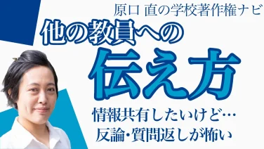 教職員向け(校内研修・啓蒙)【学校の著作権】教員にどう伝えるか?立ち位置・伝え方・考え方の3つのポイント 研修で学んだ著作権の知識を、学校内の他の教員にどう伝えるか?「校内で1人」の難しさを克服する「立ち位置」、誤解を解く「伝え方」の5つの工夫、そして権利者の気持ちを重視する「考え方」の3つのポイントを専門家が分かりやすく解説します。 2026.02.24教職員向け(校内研修・啓蒙)