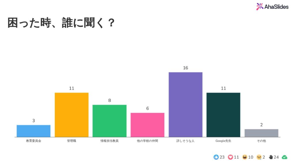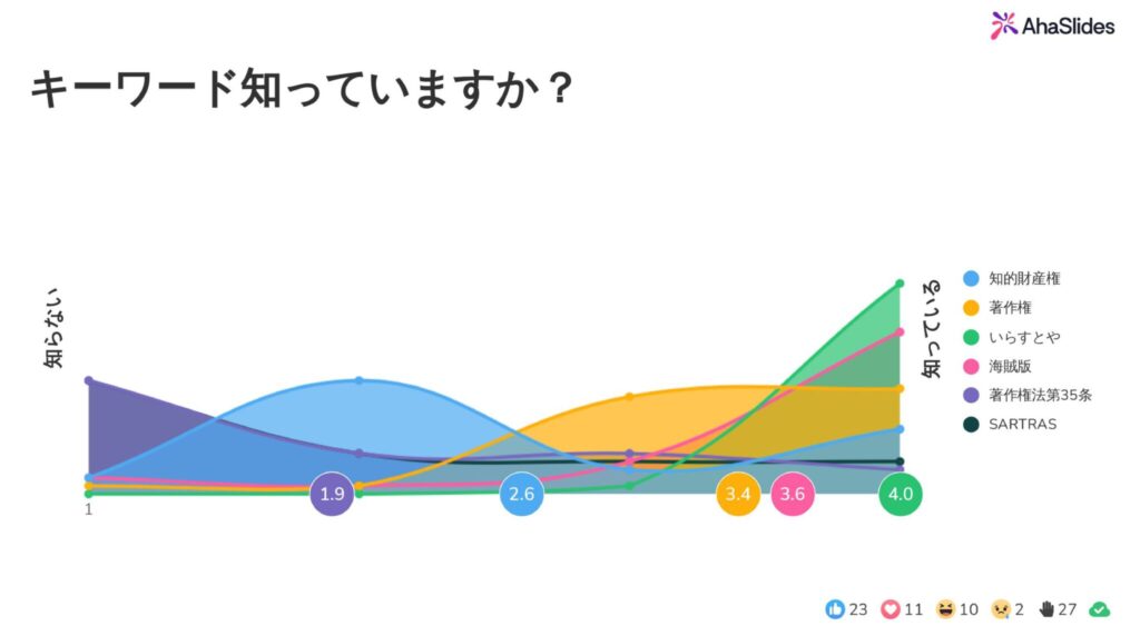 私の研修では、参加者との対話を重視しています。今回も、双方向コミュニケーションツール「AhaSlides(アハスライド)」を活用し、リアルタイムの投票や質問を受け付けながら進める参加型形式をとりました。