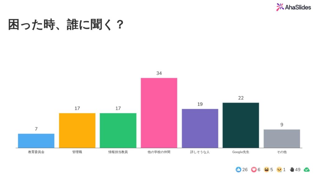 私の研修では、参加者との対話を重視しています。今回も、双方向コミュニケーションツール「AhaSlides(アハスライド)」を活用し、リアルタイムの投票や質問を受け付けながら進める参加型形式をとりました。 研修の冒頭では、まずツールの機能に慣れていただくためのアイスブレイクを実施し、楽しみながら学べる雰囲気づくりを心がけています。