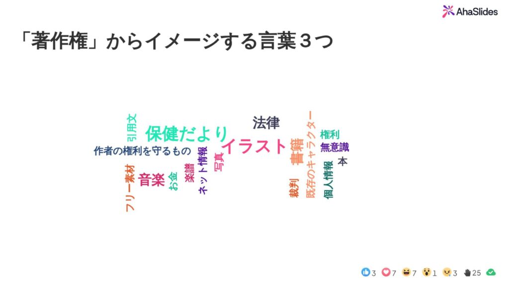 私の研修では、参加者との対話を重視しています。今回も、双方向コミュニケーションツール「AhaSlides(アハスライド)」を活用し、リアルタイムの投票や質問を受け付けながら進める参加型形式をとりました。