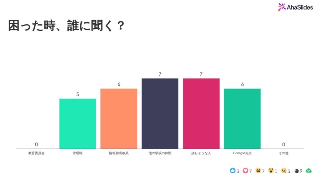 オンライン研修では一方的な講義になりがちですが、このツールを使うことで、先生方の理解度や関心事をリアルタイムに把握しながら進行することができます。研修の冒頭では、まずツールの機能に慣れていただくためのアイスブレイクを実施し、楽しみながら学べる雰囲気づくりを心がけています。