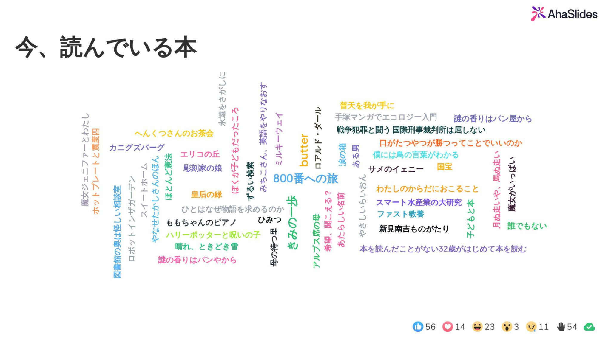 私の研修では、参加者との対話を重視しています。今回も、双方向コミュニケーションツール「AhaSlides(アハスライド)」を活用し、リアルタイムの投票や質問を受け付けながら進める参加型形式をとりました。
