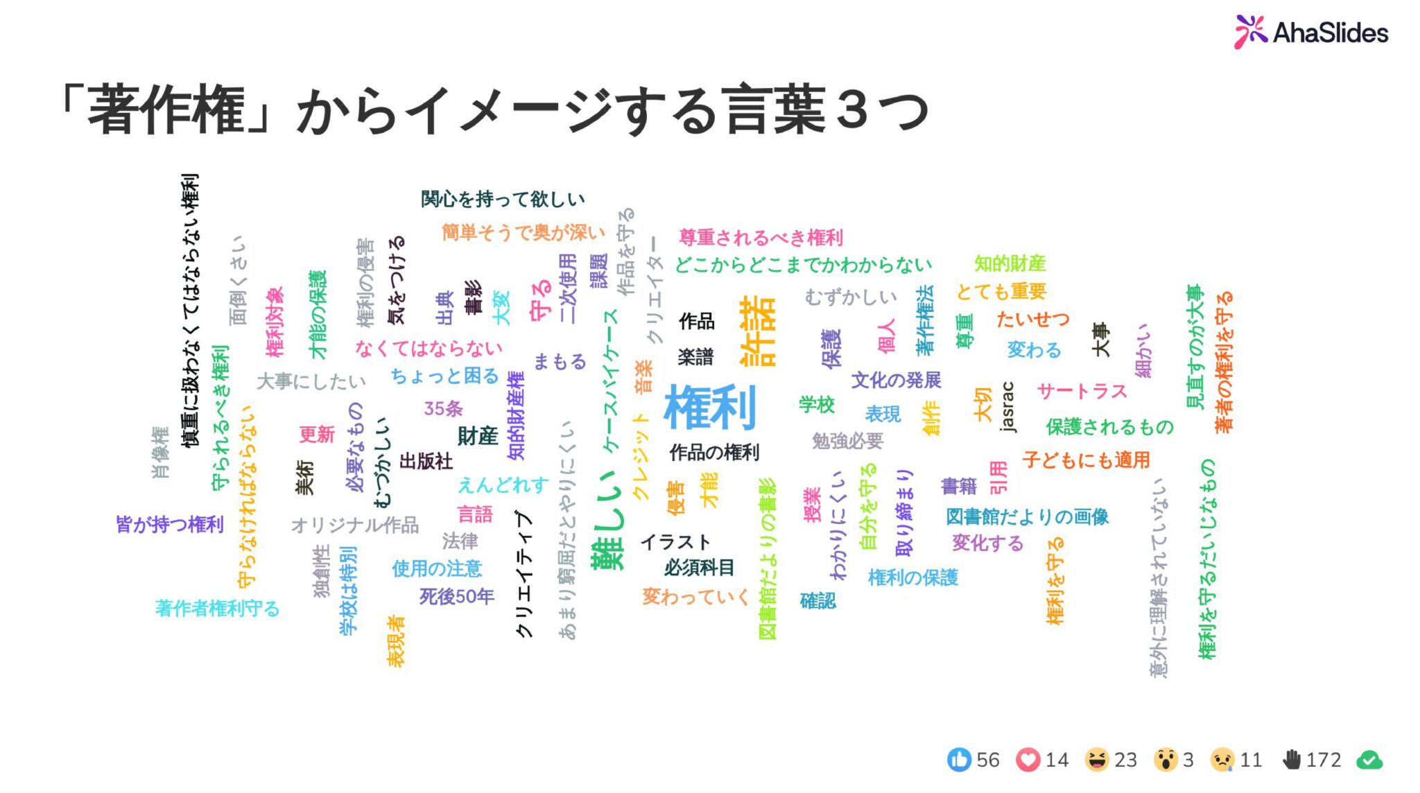 「毎月図書だよりを発行していますが、研修の中にもあったように、何か著作権侵害をしていなかっただろうかと不安になりました。書影とイラストは、都度利用規約の確認が必須だなと改めて肝に銘じました。また、いつも生徒に難しい顔をさせてしまうので、身近で楽しいものを例にとって説明してみようと思います」