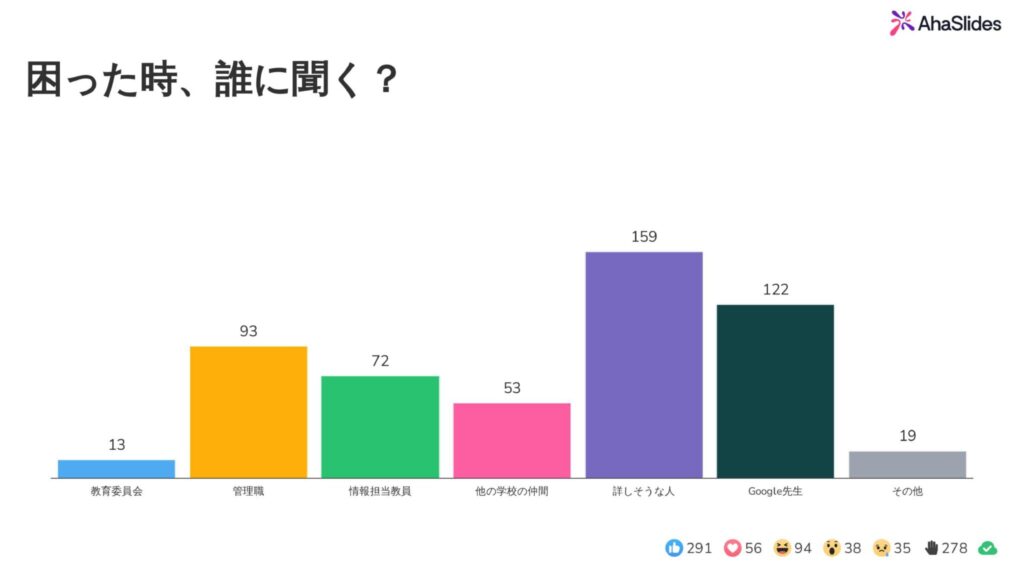 私の研修では、参加者との対話を重視しています。今回も、双方向コミュニケーションツール「AhaSlides(アハスライド)」を活用し、リアルタイムの投票や質問を受け付けながら進める参加型形式をとりました。