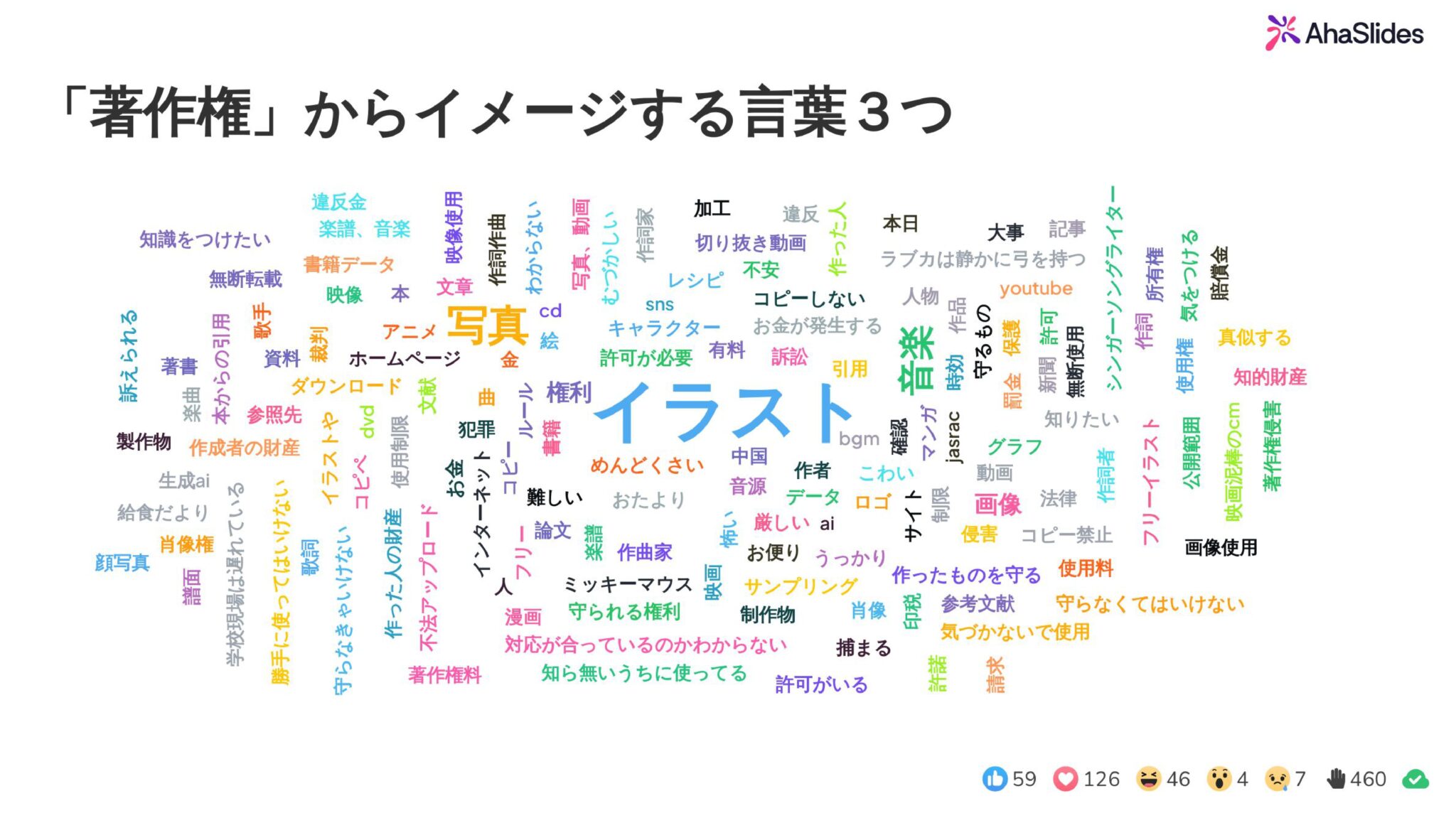 「学校でよくある著作権に関わる場面をとても詳しくリアルに解説していただけて大変勉強になりました。イラスト等を使用する時は著作権を意識して使用していきたいと改めて思いました。著作権は難しい印象が強く、利用規約を読んでもよく分からないことも多かったのでよい機会となりました」