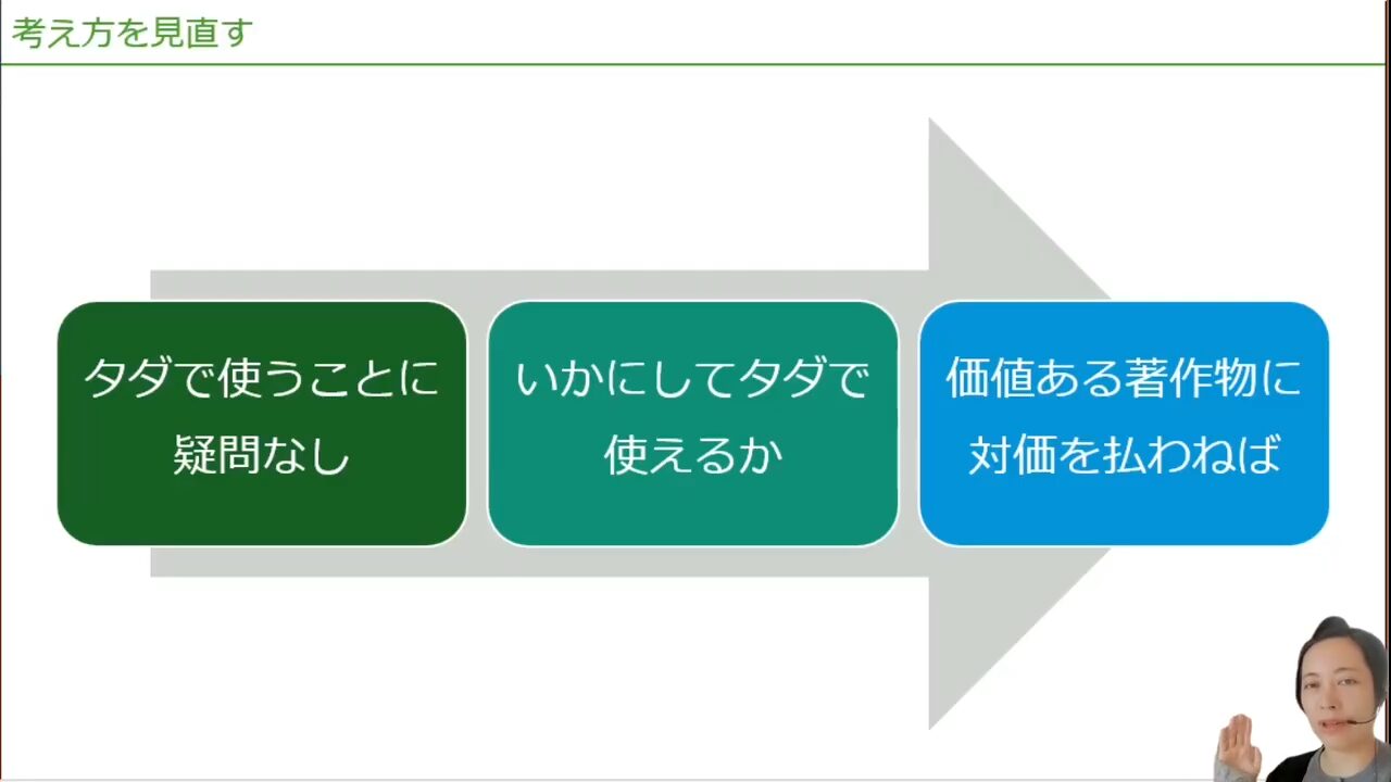 自治体や学校で講演を行うと、著作物の使い方について「いかにしてタダで使えるか」「無許諾・無償で使えるか、その範囲を知りたい」という質問がほとんどです。この考え方を見直してみていただきたいです。