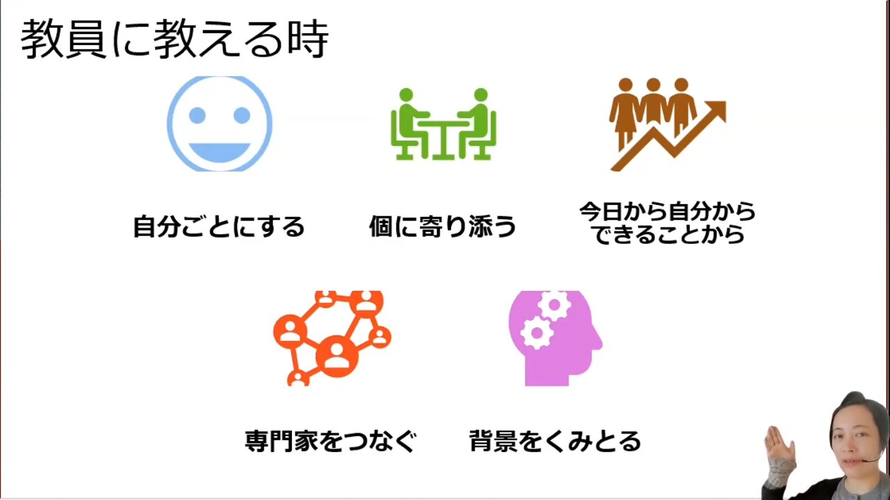 教員への伝え方のコツを3つ(立ち位置・伝え方・考え方)お話ししました。