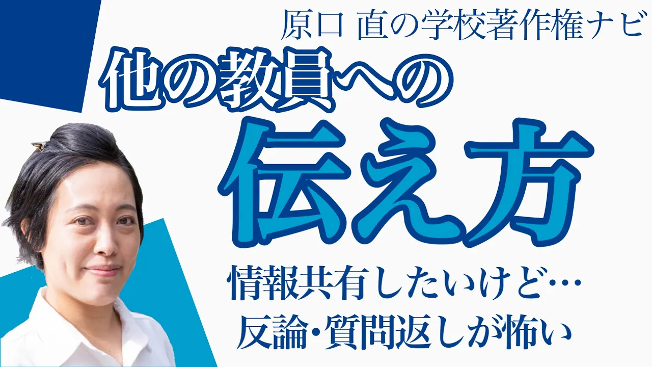研修などで著作権について触れる機会が広がってきていると思いますが、知った著作権を職員室や他の教職員など他の人たちに「どう伝えるか」ということが重要になってきます。